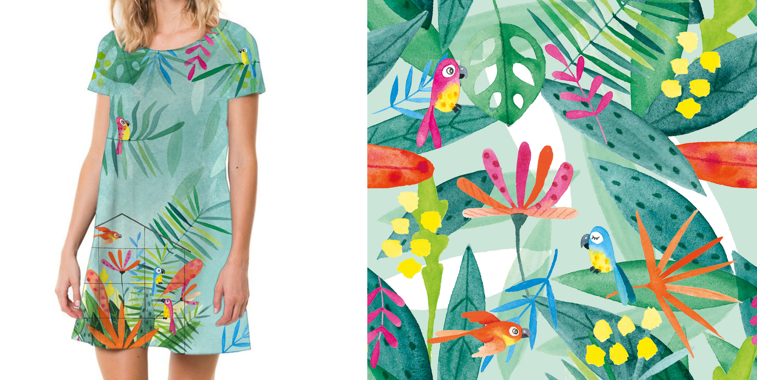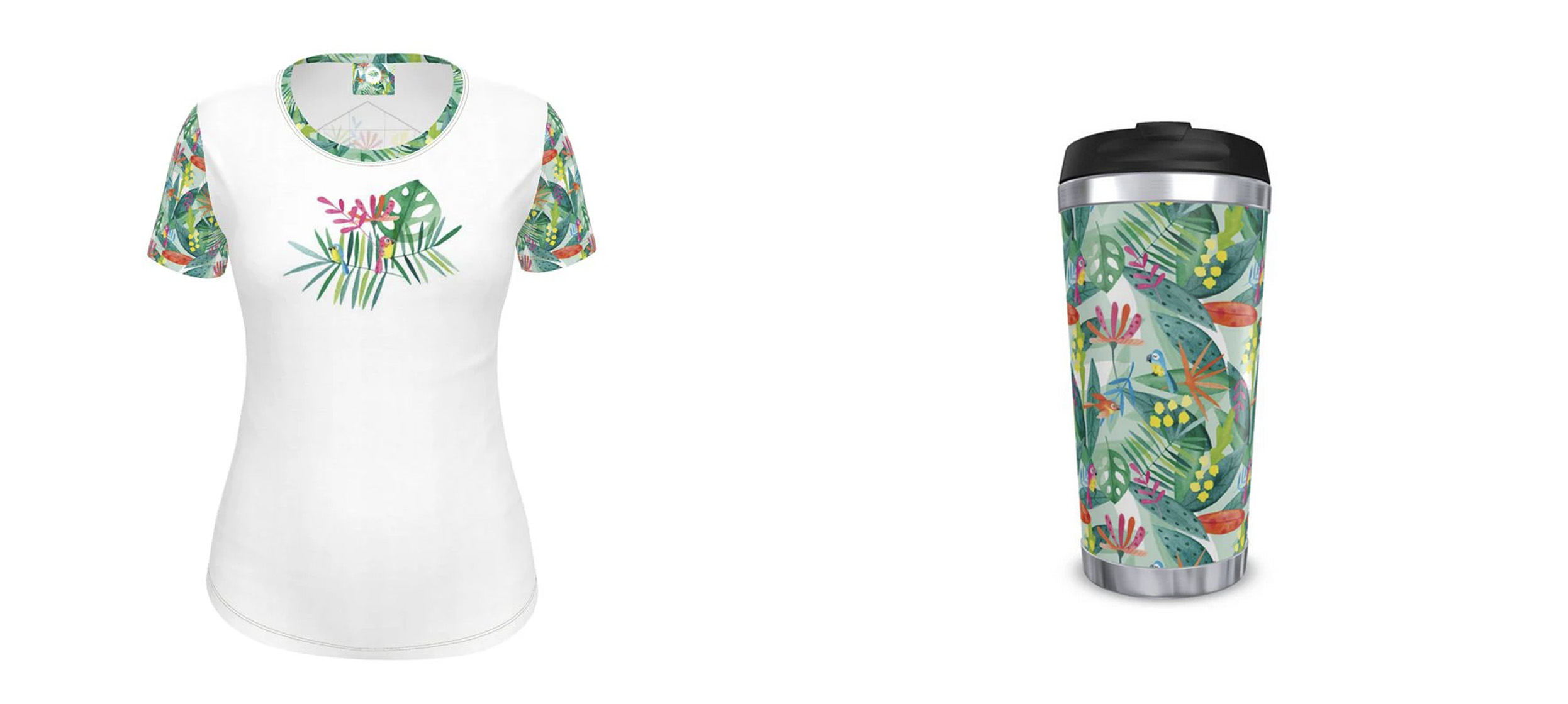 Le thème “Perroquets” a été décliné sur de nombreux produits : vêtements, accessoires (bob, serviette de plage, maillot de bain, mug…).